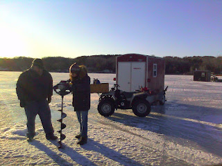 The pre-party event before the birthday party was ice fishing on the lake in front of Jimbo and Margie's house. One of their neighbors hosted this Mac guys in his ice fishing house and a good time was had by all - although they didn't come back with anything to help with the menu for the evening....maybe next year.